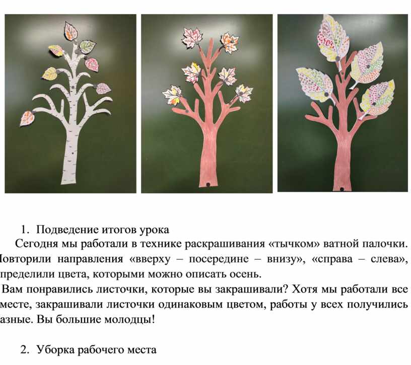Сегодня мы работали в технике раскрашивания «тычком» ватной палочки. Повторили направления «вверху – посередине – внизу», «справа – слева», определили цвета, которыми можно описать осень.