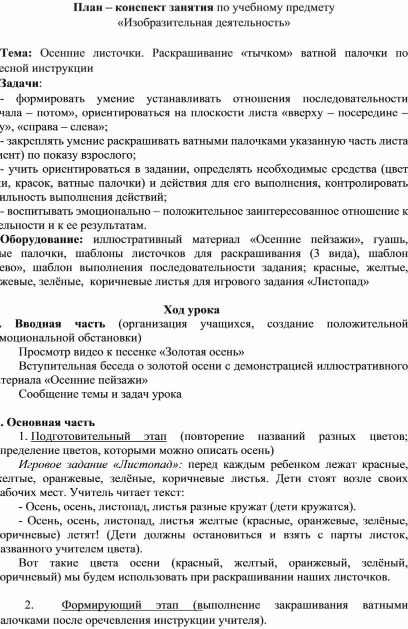 Оборудование: иллюстративный материал «Осенние пейзажи», гуашь, ватные палочки, шаблоны листочков для раскрашивания (3 вида), шаблон «дерево», шаблон выполнения последовательности задания; красные, желтые, оранжевые, зелёные, коричневые листья для игрового задания «Листопад»