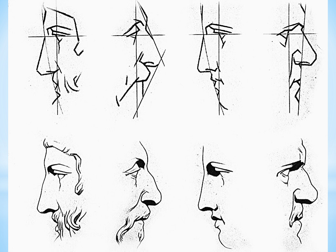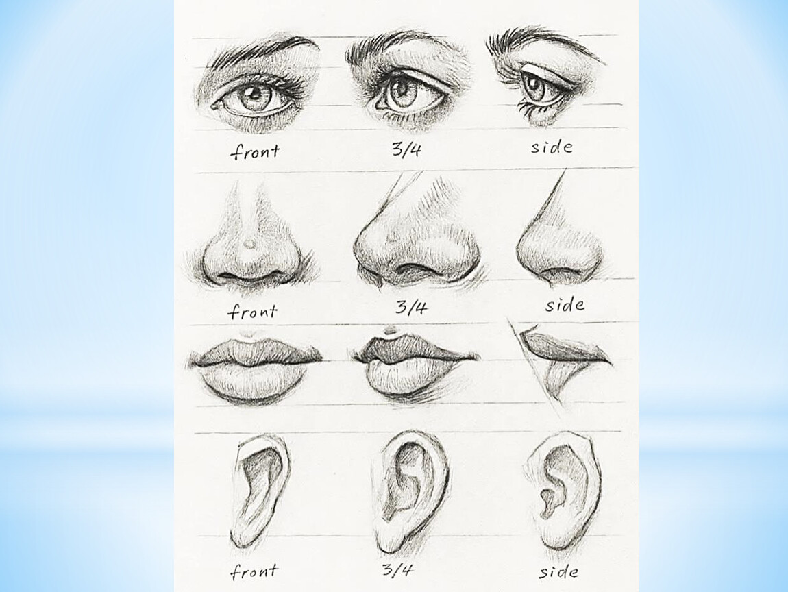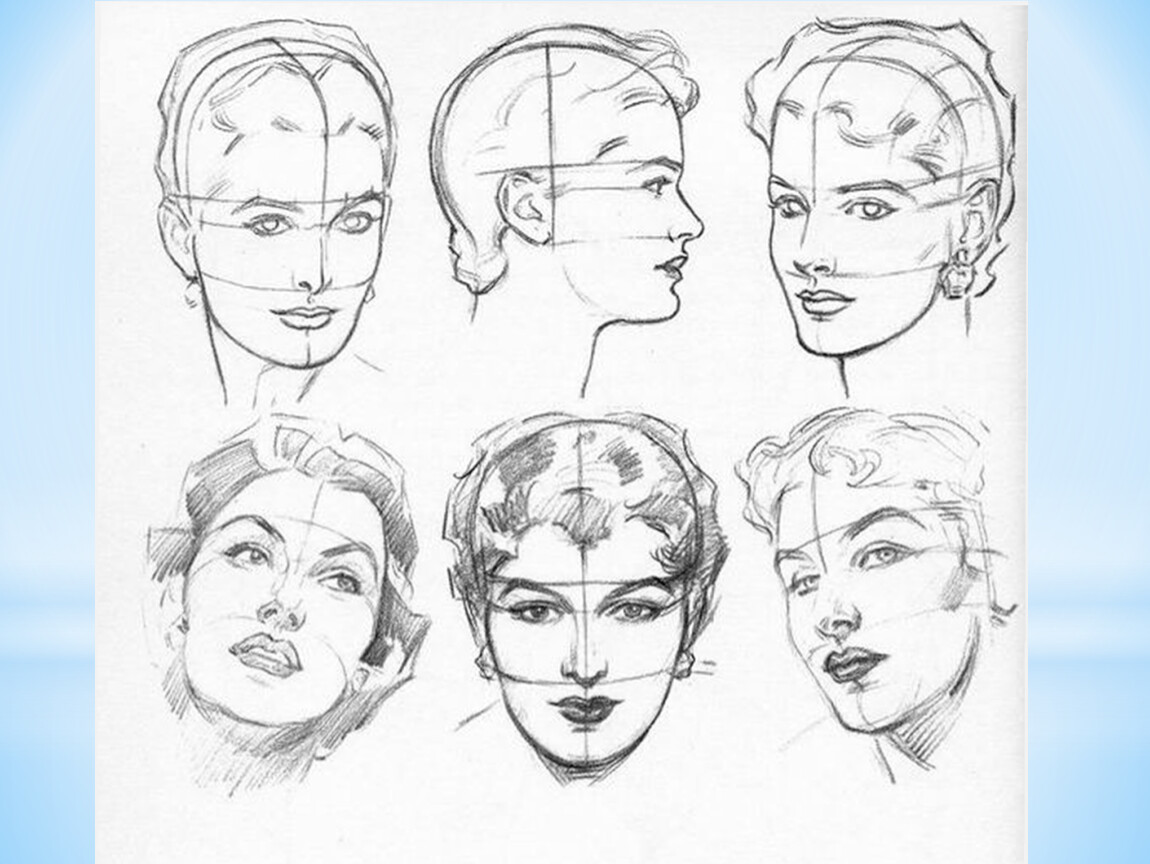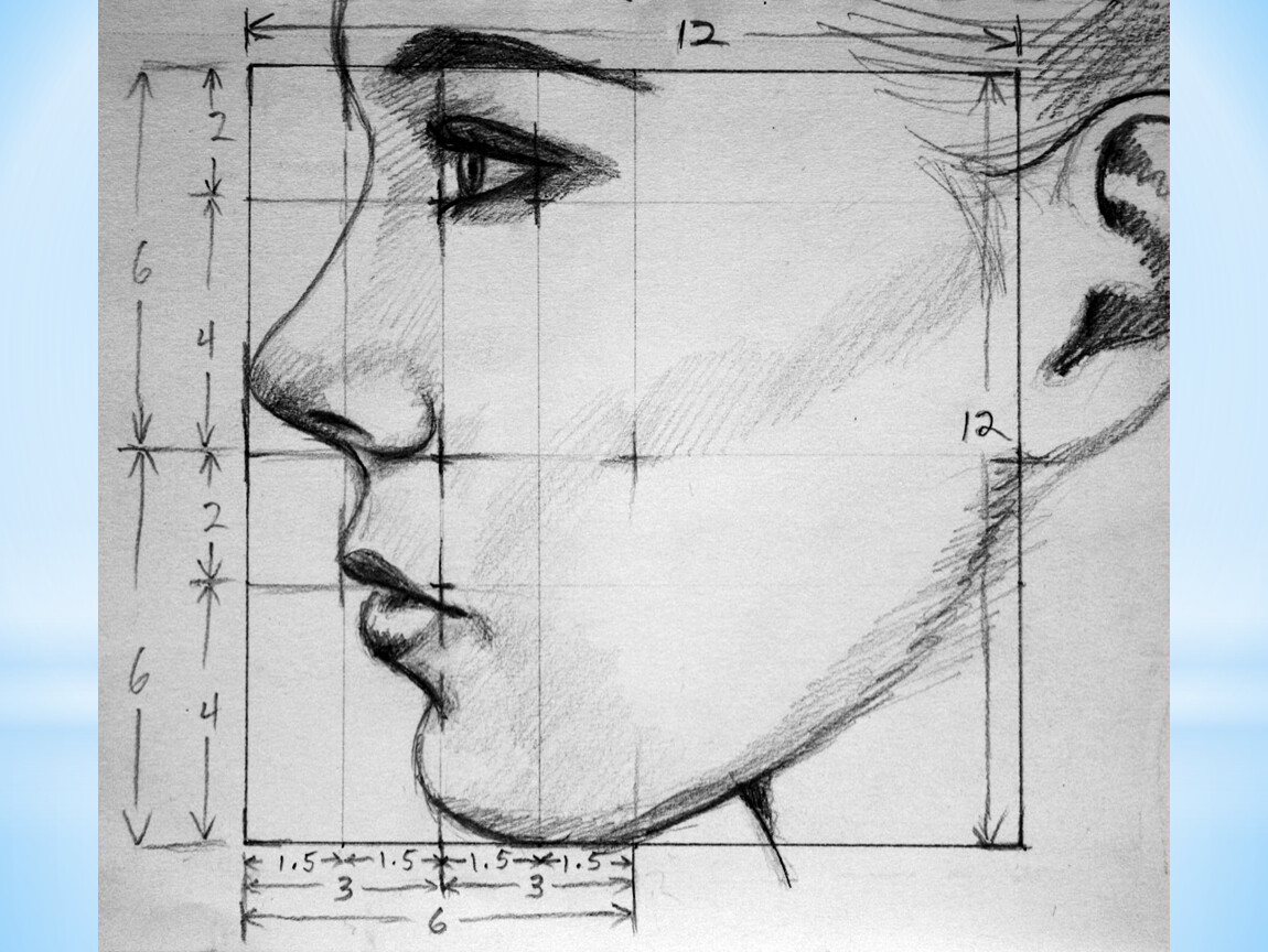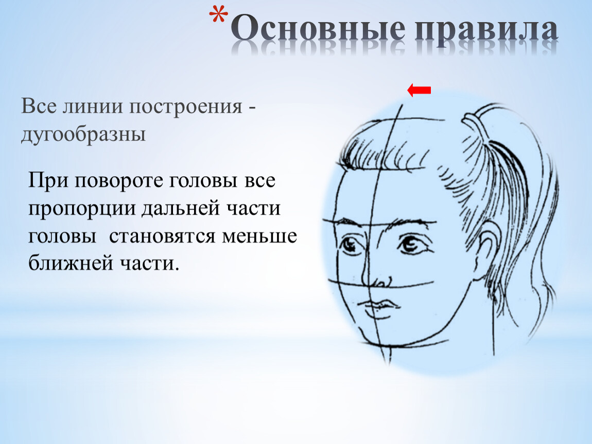 При повороте головы все пропорции дальней части головы становятся меньше ближней части.
