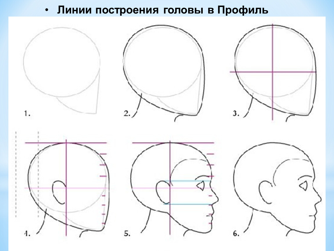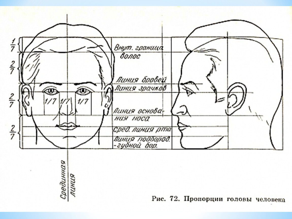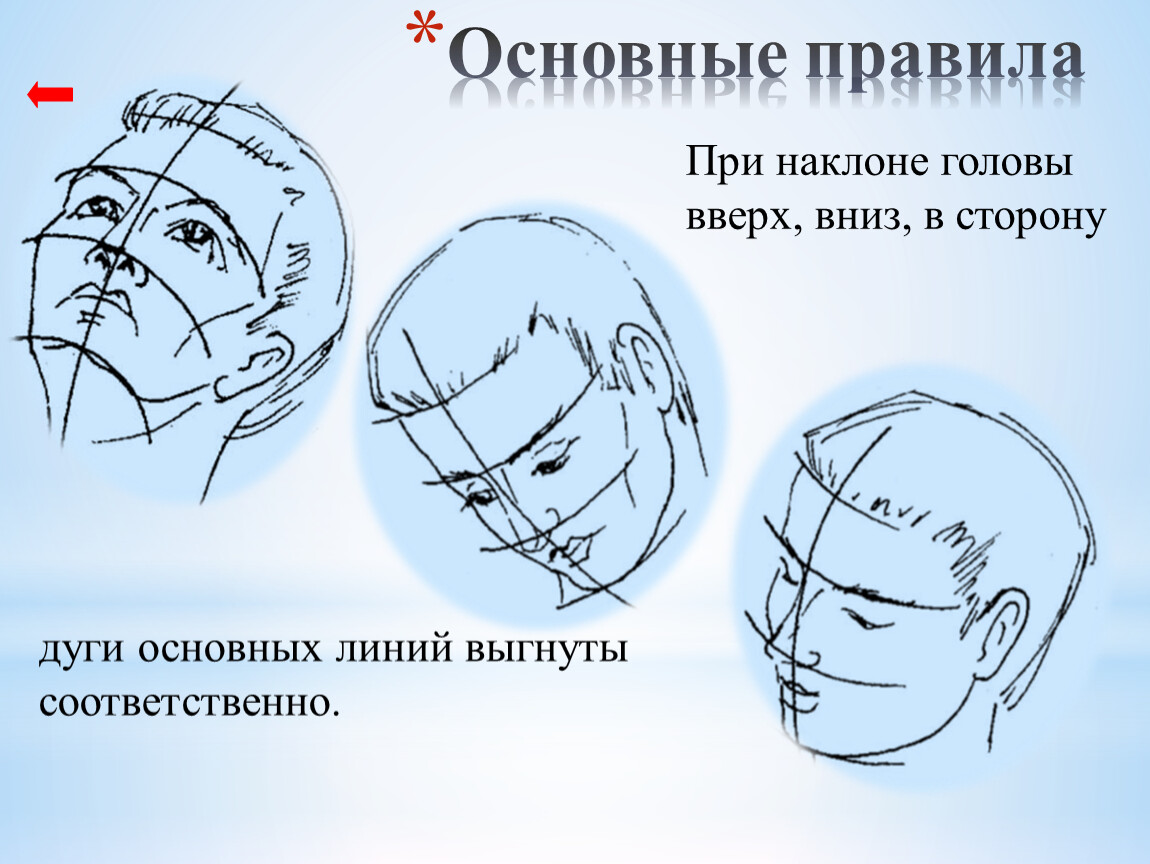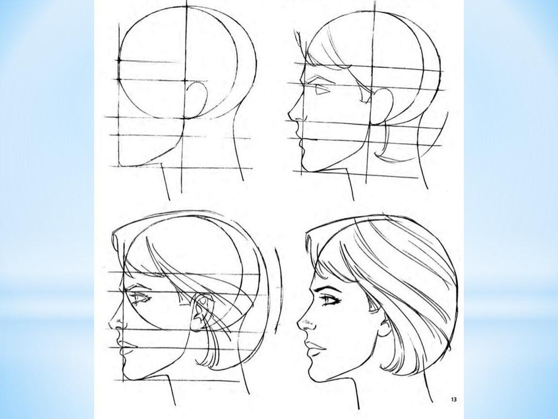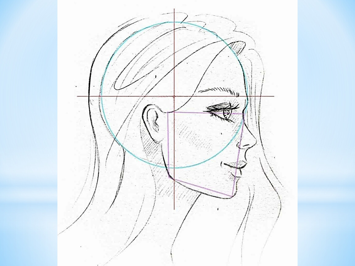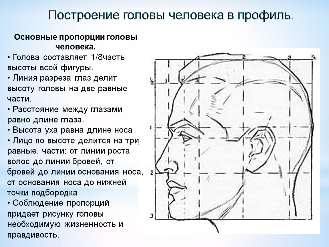 При повороте головы все пропорции дальней части головы становятся меньше ближней части.