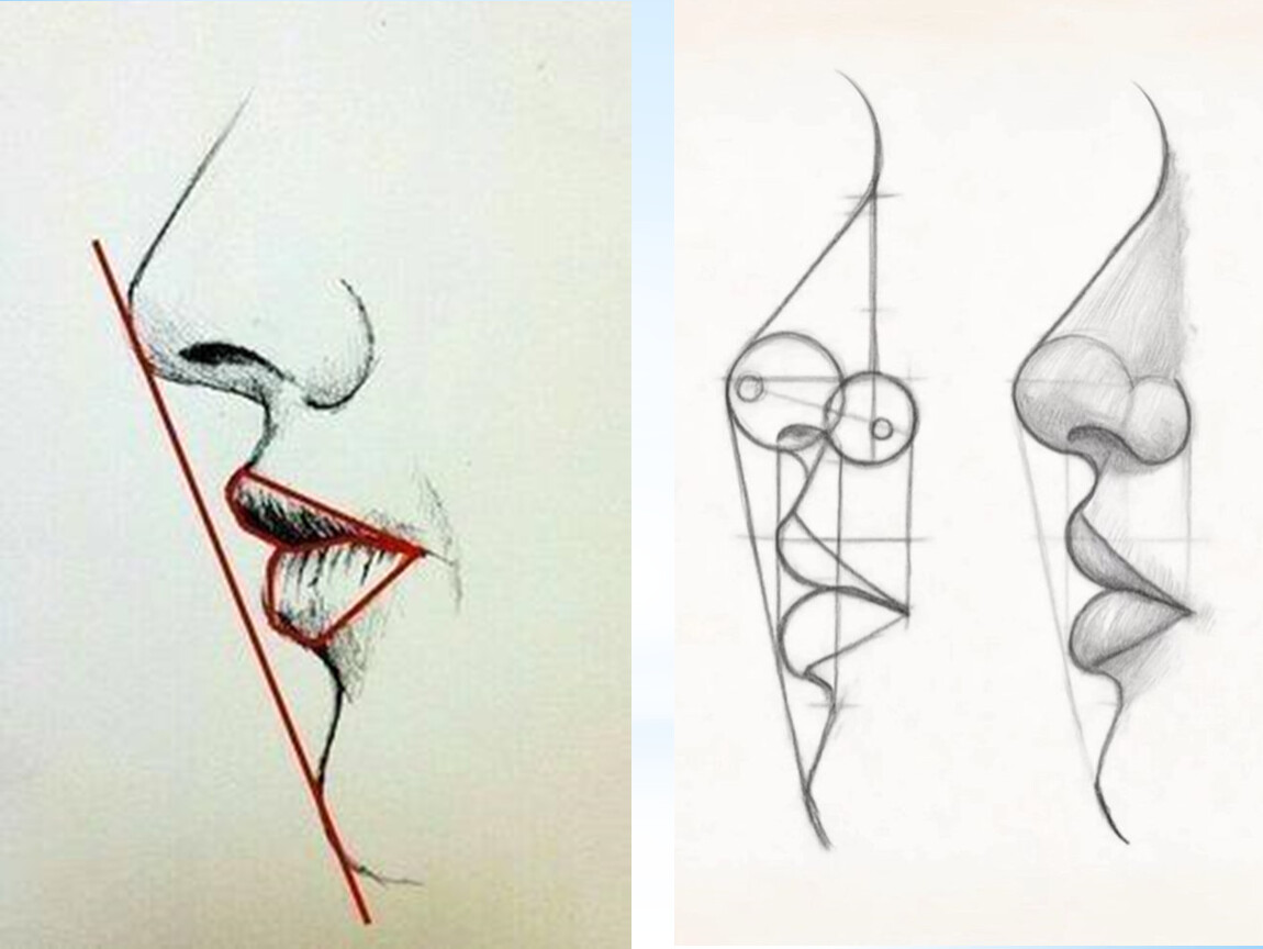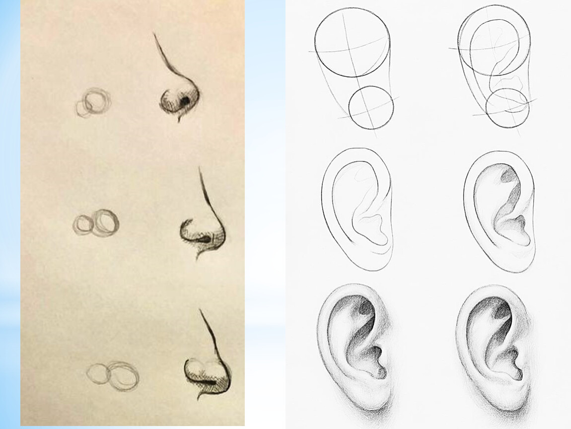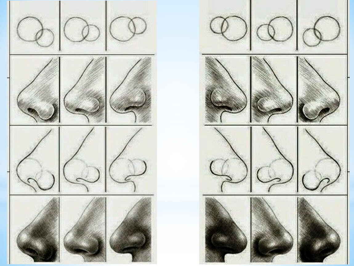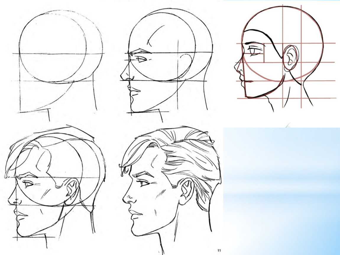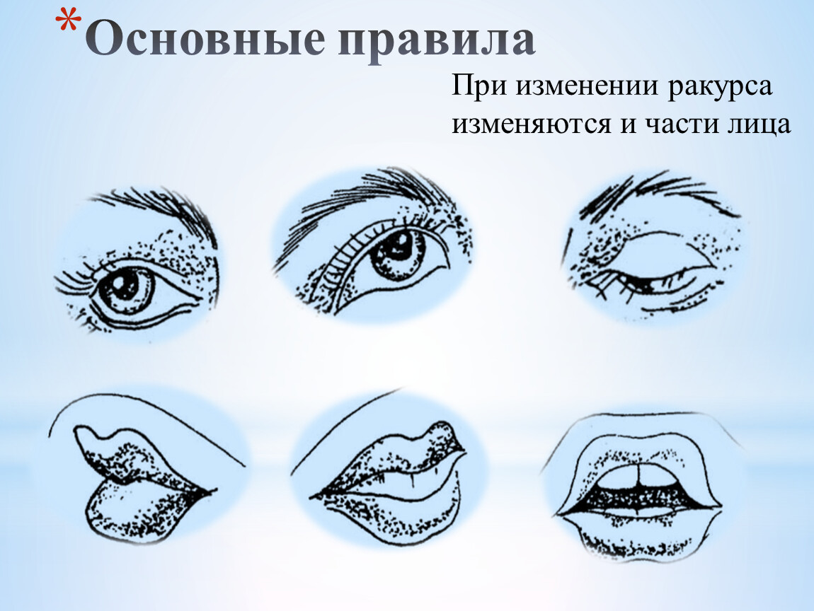 При повороте головы все пропорции дальней части головы становятся меньше ближней части.