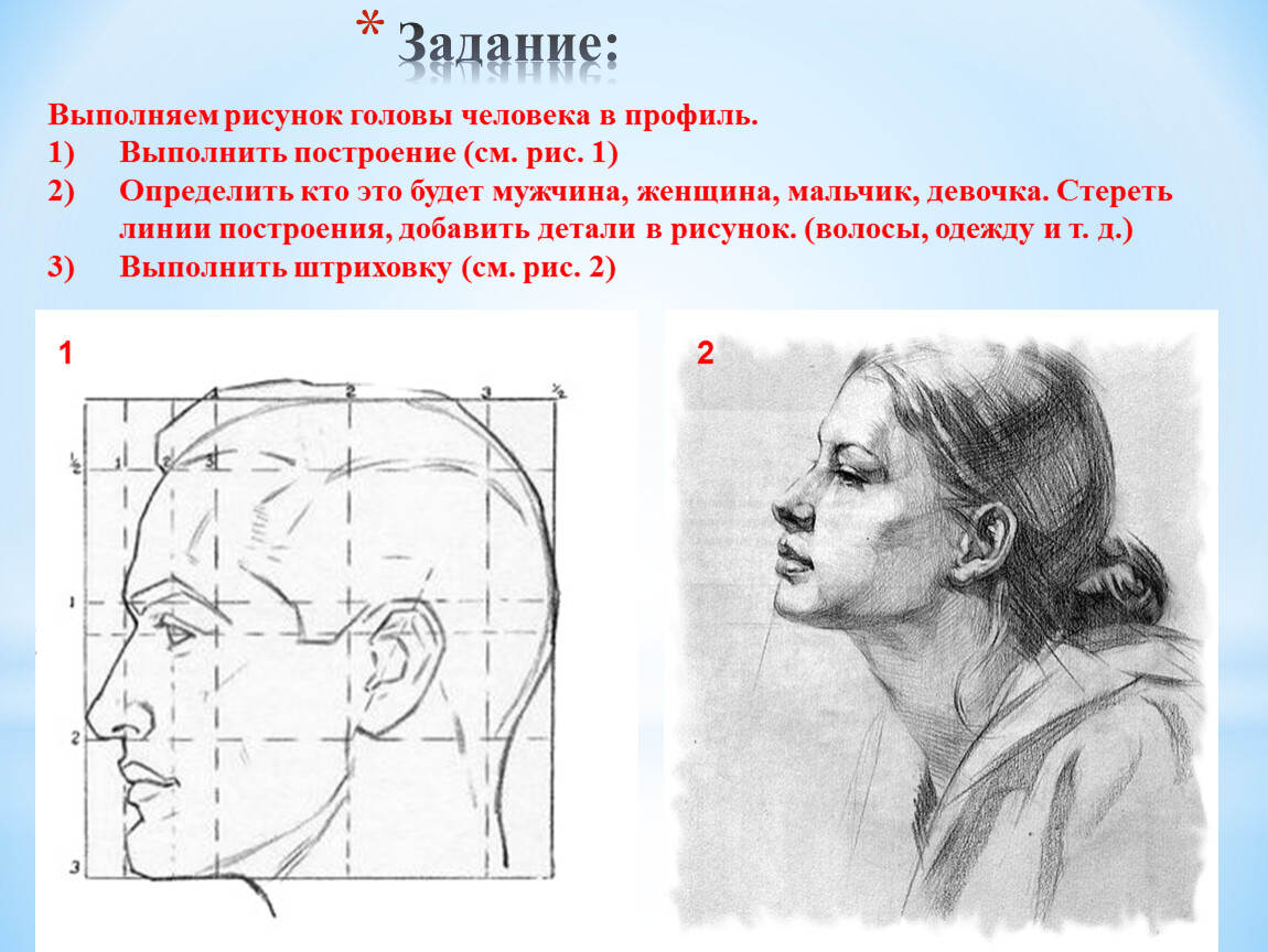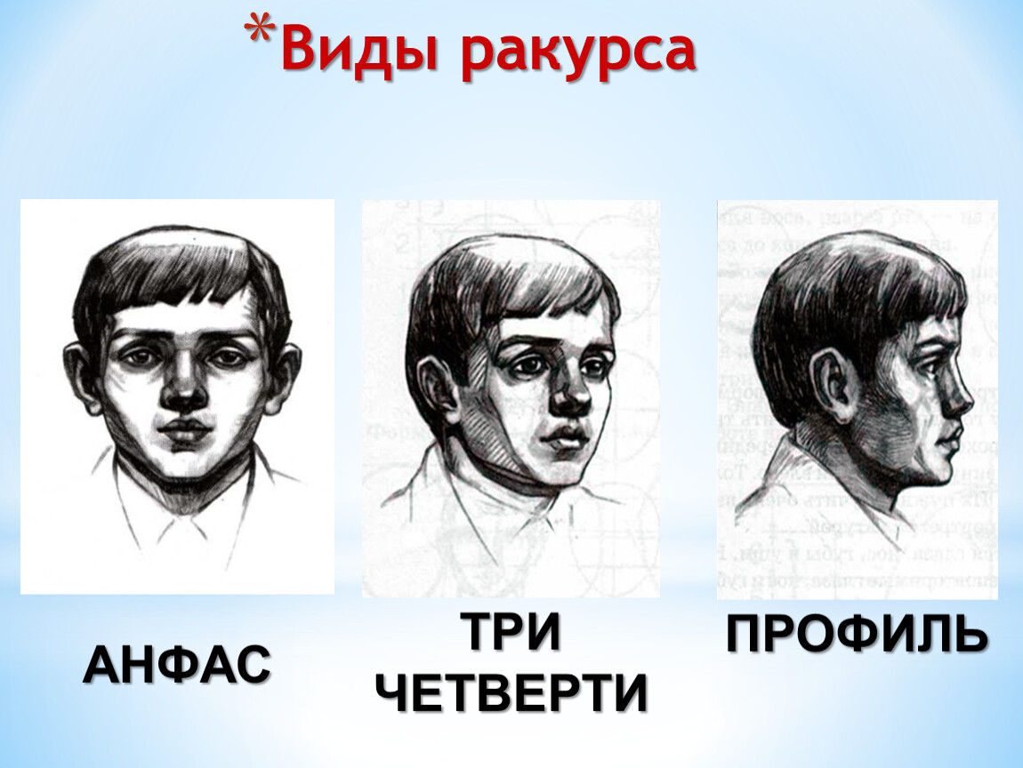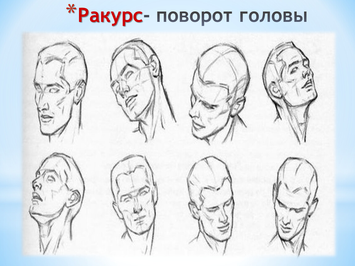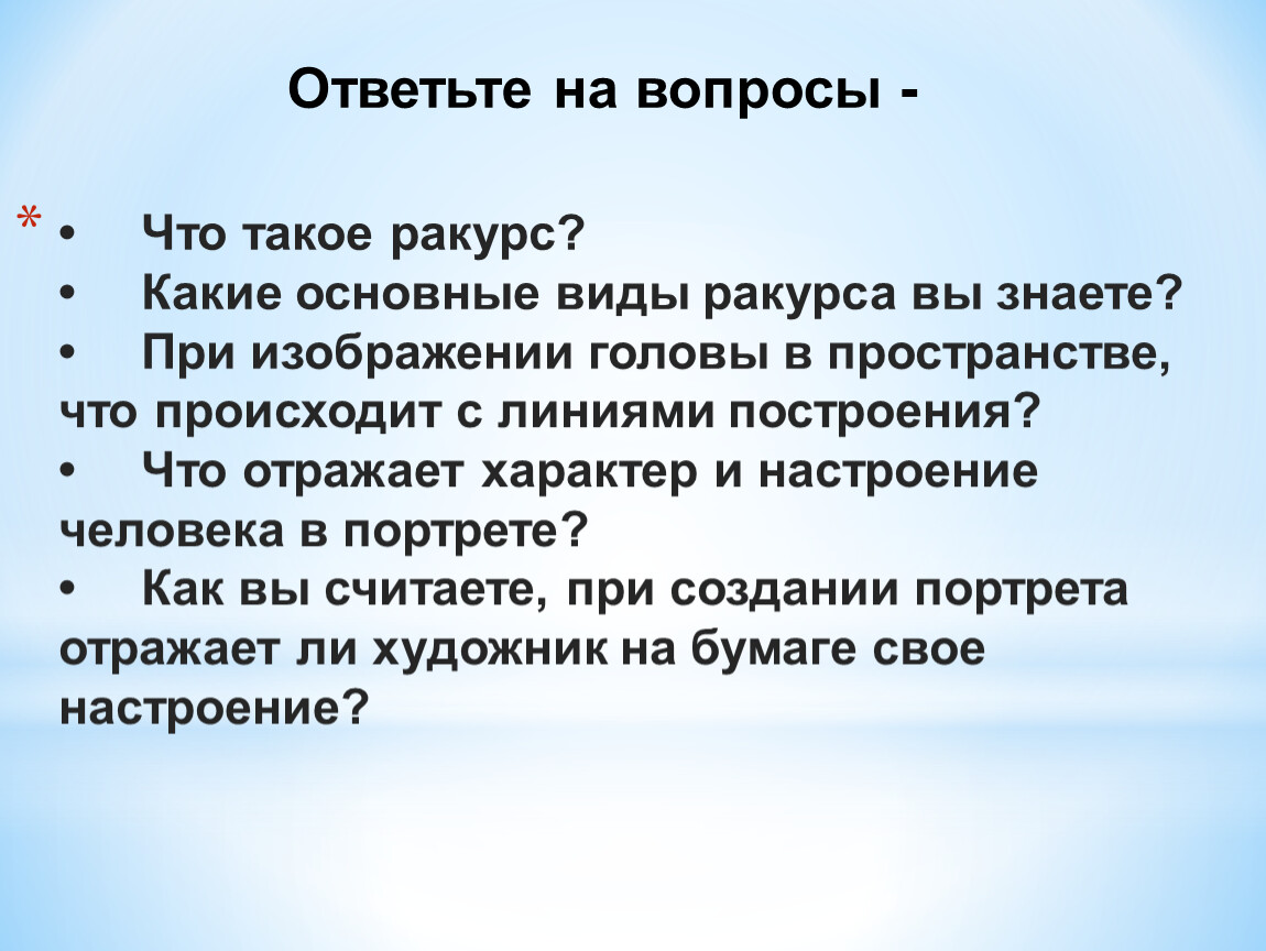 • Что такое ракурс?• Какие основные виды ракурса вы знаете?• При изображении головы в пространстве, что происходит с линиями построения?• Что отражает характер и настроение человека в портрете?• Как вы считаете, при создании портрета отражает ли художник на бумаге свое настроение?