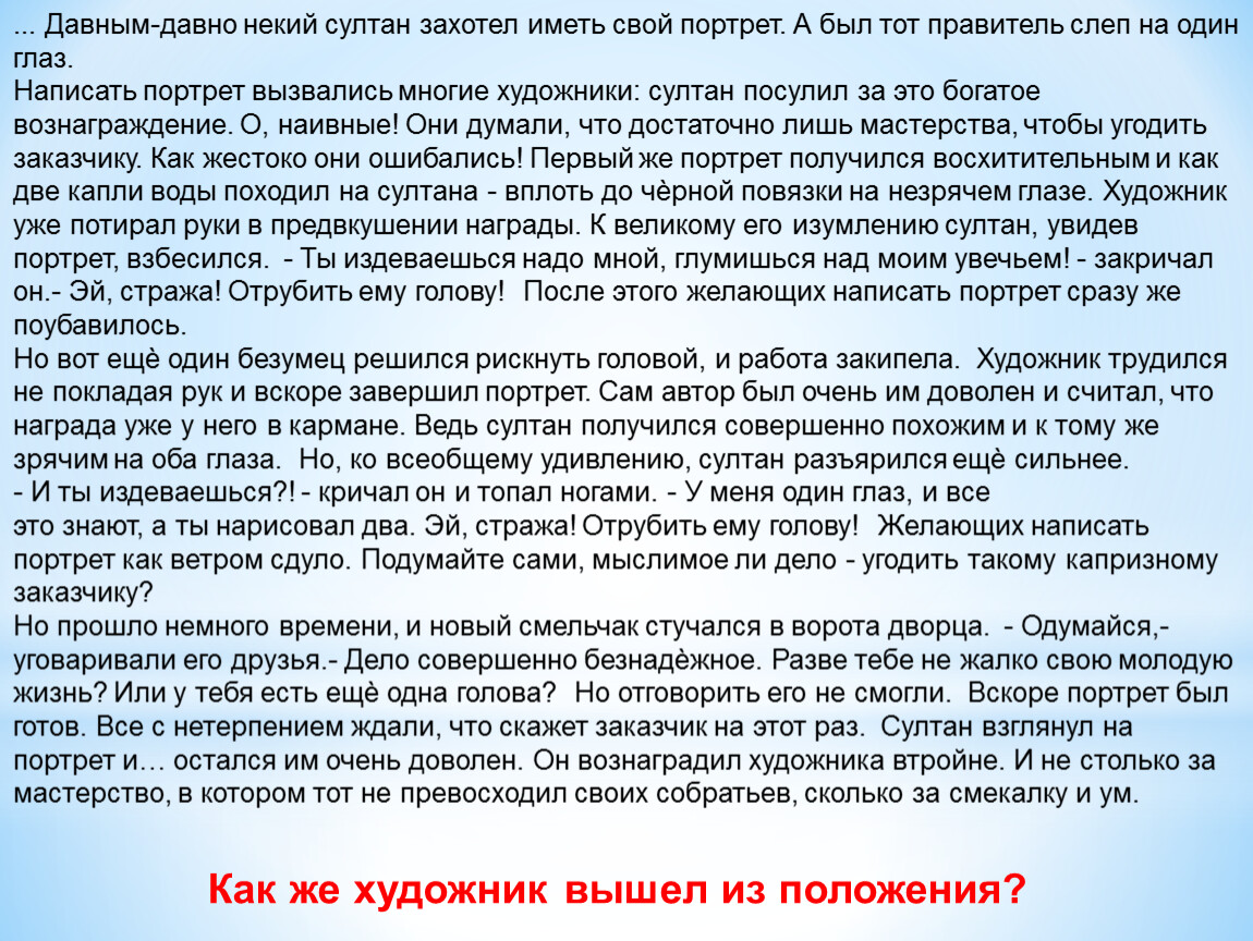 Но прошло немного времени, и новый смельчак стучался в ворота дворца. - Одумайся,- уговаривали его друзья.- Дело совершенно безнадѐжное. Разве тебе не жалко свою молодую жизнь? Или у тебя есть ещѐ одна голова? Но отговорить его не смогли. Вскоре портрет был готов. Все с нетерпением ждали, что скажет заказчик на этот раз. Султан взглянул на портрет и… остался им очень доволен. Он вознаградил художника втройне. И не столько за мастерство, в котором тот не превосходил своих собратьев, сколько за смекалку и ум.
