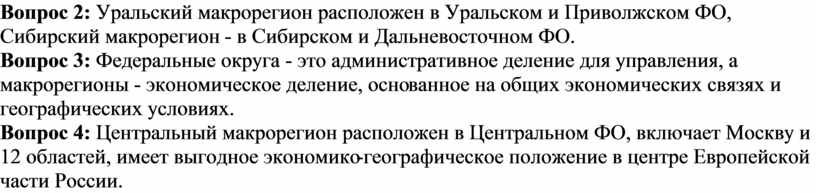 Вопрос 2: Уральский макрорегион расположен в Уральском и Приволжском ФО, Сибирский макрорегион - в Сибирском и Дальневосточном ФО.