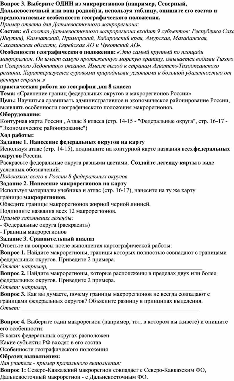 Вопрос 3. Выберите ОДИН из макрорегионов (например, Северный, Дальневосточный или ваш родной) и, используя таблицу, опишите его состав и предполагаемые особенности географического положения.