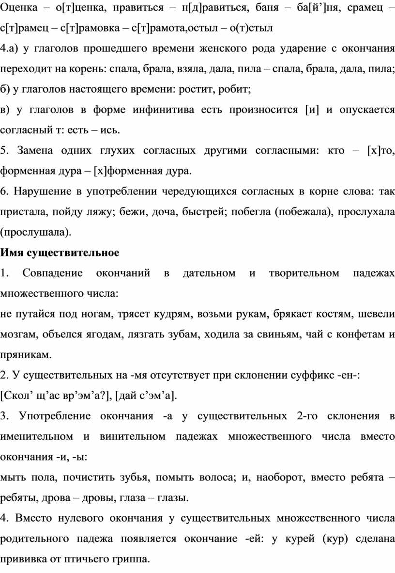 6. Нарушение в употреблении чередующихся согласных в корне слова: так пристала, пойду ляжу; бежи, доча, быстрей; побегла (побежала), прослухала (прослушала).