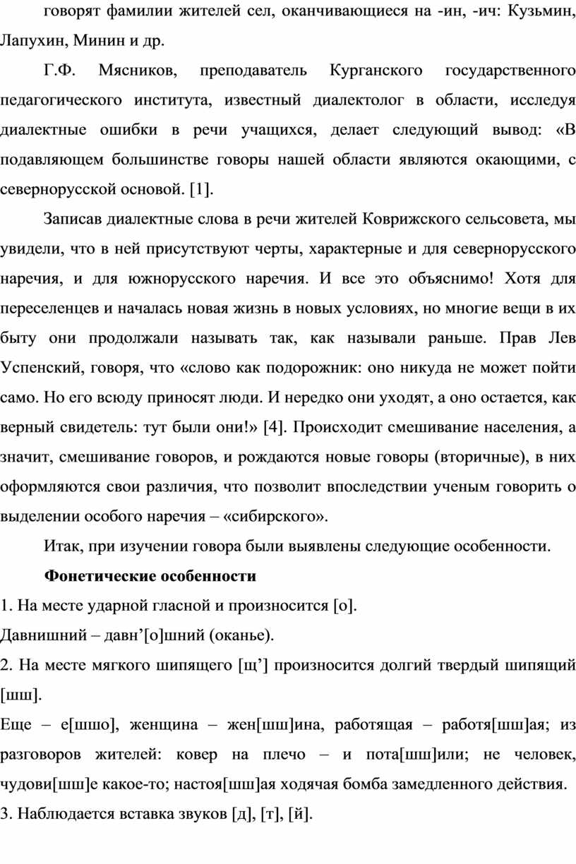 Г.Ф. Мясников, преподаватель Курганского государственного педагогического института, известный диалектолог в области, исследуя диалектные ошибки в речи учащихся, делает следующий вывод: «В подавляющем большинстве говоры нашей области являются окающими, с севернорусской основой. [1].
