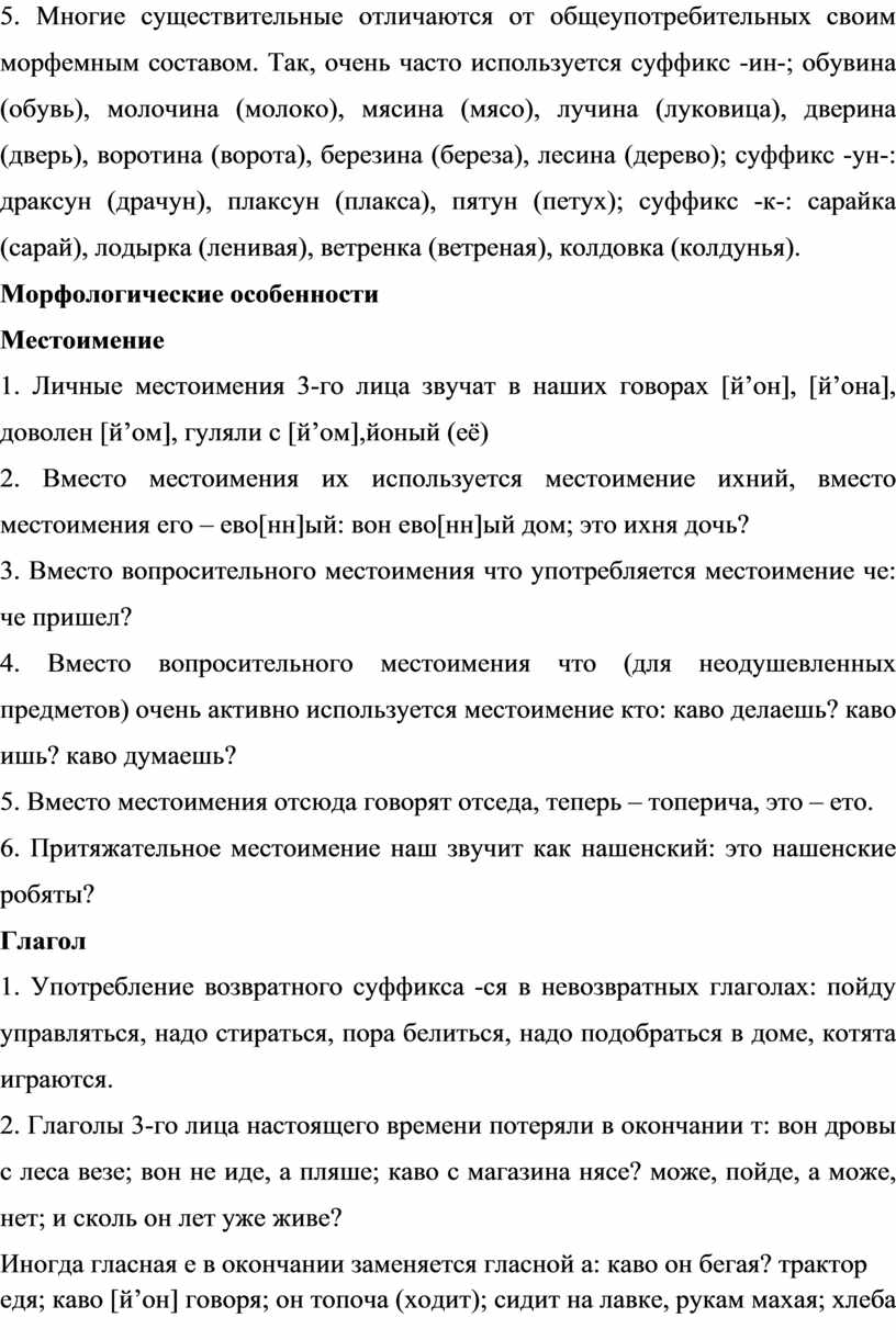 5. Многие существительные отличаются от общеупотребительных своим морфемным составом. Так, очень часто используется суффикс -ин-; обувина (обувь), молочина (молоко), мясина (мясо), лучина (луковица), дверина (дверь), воротина (ворота), березина (береза), лесина (дерево); суффикс -ун-: драксун (драчун), плаксун (плакса), пятун (петух); суффикс -к-: сарайка (сарай), лодырка (ленивая), ветренка (ветреная), колдовка (колдунья).