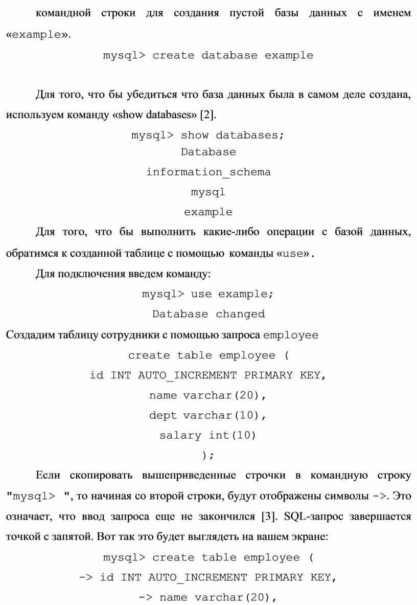 Если скопировать вышеприведенные строчки в командную строку "mysql> ", то начиная со второй строки, будут отображены символы ->. Это означает, что ввод запроса еще не закончился [3]. SQL-запрос завершается точкой с запятой. Вот так это будет выглядеть на вашем экране: