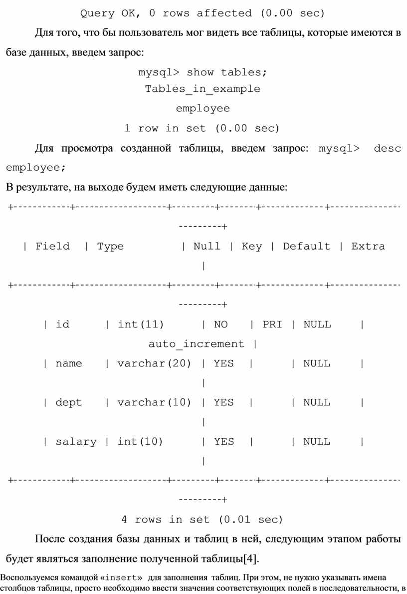 Для просмотра созданной таблицы, введем запрос: mysql> desc employee;