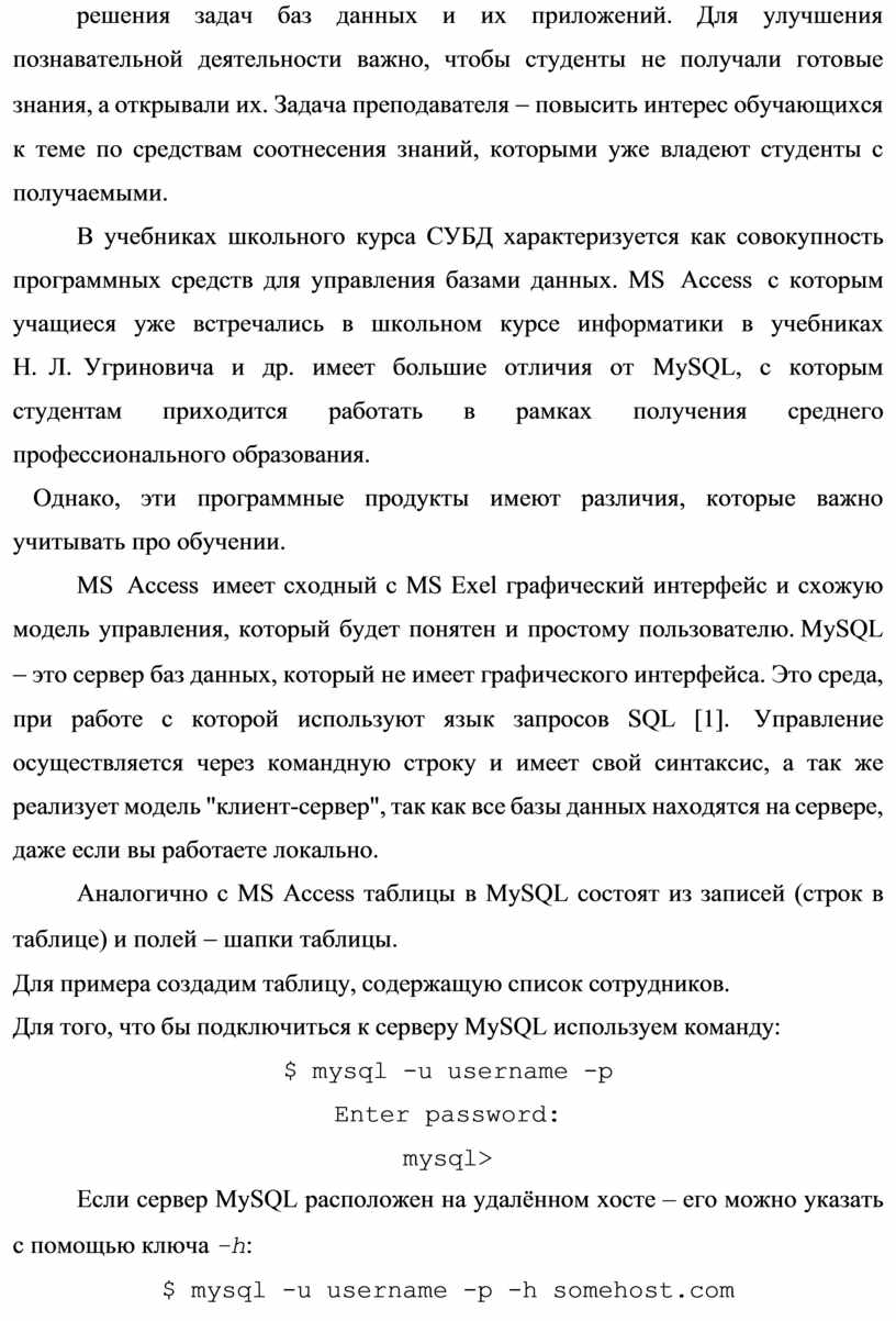 В учебниках школьного курса СУБД характеризуется как совокупность программных средств для управления базами данных. MS Access с которым учащиеся уже встречались в школьном курсе информатики в учебниках Н. Л. Угриновича и др. имеет большие отличия от MySQL, с которым студентам приходится работать в рамках получения среднего профессионального образования.