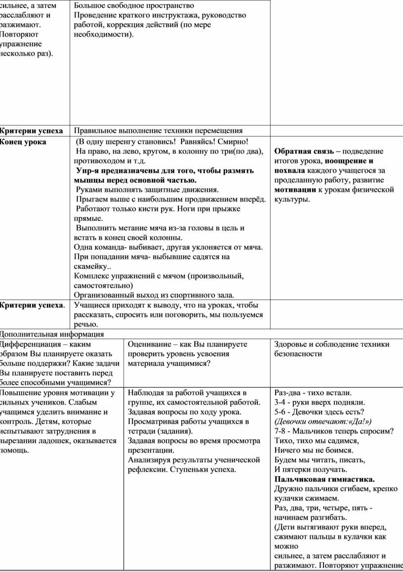 Актуализация жизненного опыта. Подводящие упражнения на освоение скрестного шага (выполняются фронтально): 1. Техника перемещений: Порядок выполнения: а) объяснение; б) показ учениками – помощниками. Следить за правильными перемещениями, работой рук и ног в защитной стойке. а) приставной шаг – рывок; б) передвижения боком приставными шагами «змейкой» спиной вперёд; в) бег «змейкой» лицом вперёд 2.Перемещения приставными шагами по треугольнику 6х 6 метров: 1) спиной вперед; 2) лицом вперед; 3) правым боком; 4) спиной вперед; 5) лицом вперед; 6) левым боком. 3. Техника сочетания приёмов: ведения, броска, подбора мяча. - ведение, 2 шага, бросок. Ведение (обводка трёхсекундной зоны) правой рукой, 2 шага, бросок одной рукой (правой) от плеча; Подбор мяча, ведение левой рукой (обводка) 2 шага, бросок одной рукой (левой) от плеча. 4. Учебная игра в баскетбол по упрощенным правилам Игра должна вестись в пределах площадки. Нельзя применять грубые приемы, а также бегать с мячом в руках. 5. Штрафные броски. Каждая команда построена в колонну, броски выполняются по очереди (используются все баскетбольные щиты в спортивном зале). При выполнении штрафного броска встать у линии штрафного броска, сделать 1-2 удара в пол, глубокий вдох-выдох, и на задержке дыхания выполнить бросок. Раз-два - тихо встали. 3-4 - руки вверх подняли. 5-6 - Девочки здесь есть? (Девочки отвечают:«Да!») 7-8 - Мальчиков теперь спросим? Тихо, тихо мы садимся, Ничего мы не боимся. Будем мы читать, писать, И пятерки получать. Пальчиковая гимнастика. Дружно пальчики сгибаем, крепко кулачки сжимаем. Раз, два, три, четыре, пять - начинаем разгибать. (Дети вытягивают руки вперед, сжимают пальцы в кулачки как можно сильнее, а затем расслабляют и разжимают. Повторяют упражнение несколько раз). |