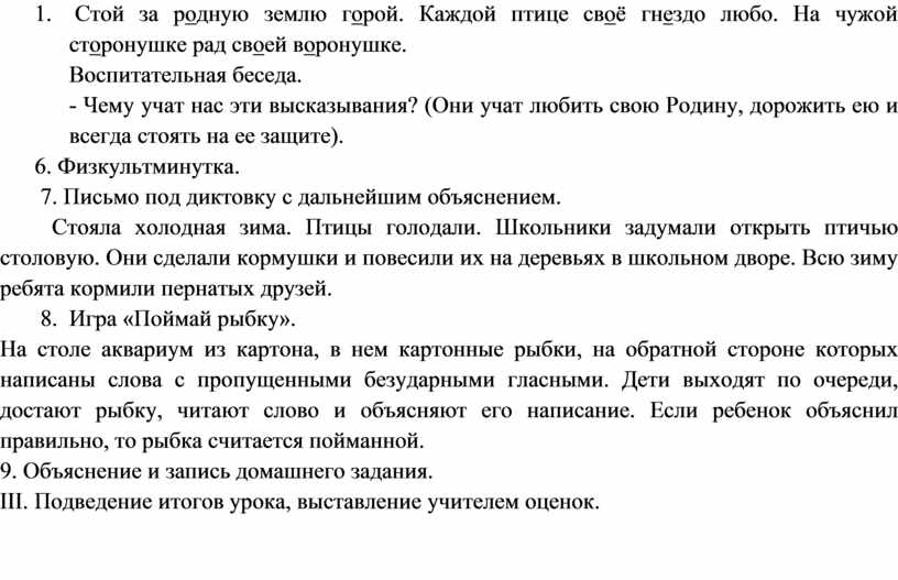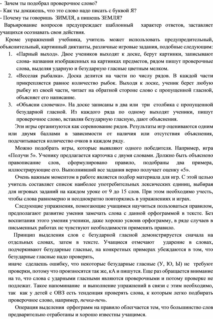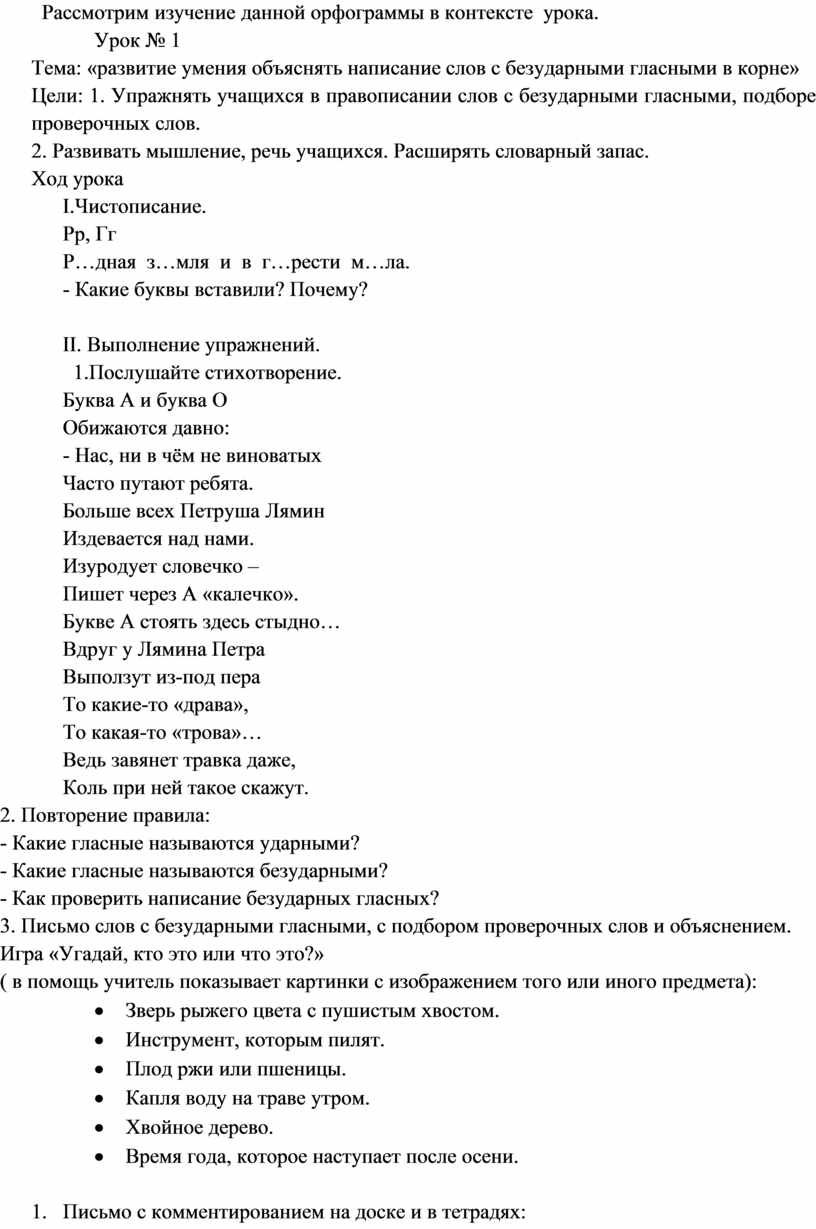 Принцип выделения слов с безударной гласной демонстрируется сначала на отдельных словах, затем в тексте. Учащиеся отмечают ударение в словах, подчеркивают безударные гласные, на конкретных примерах убеждаются в том, что безударные гласные надо проверять,