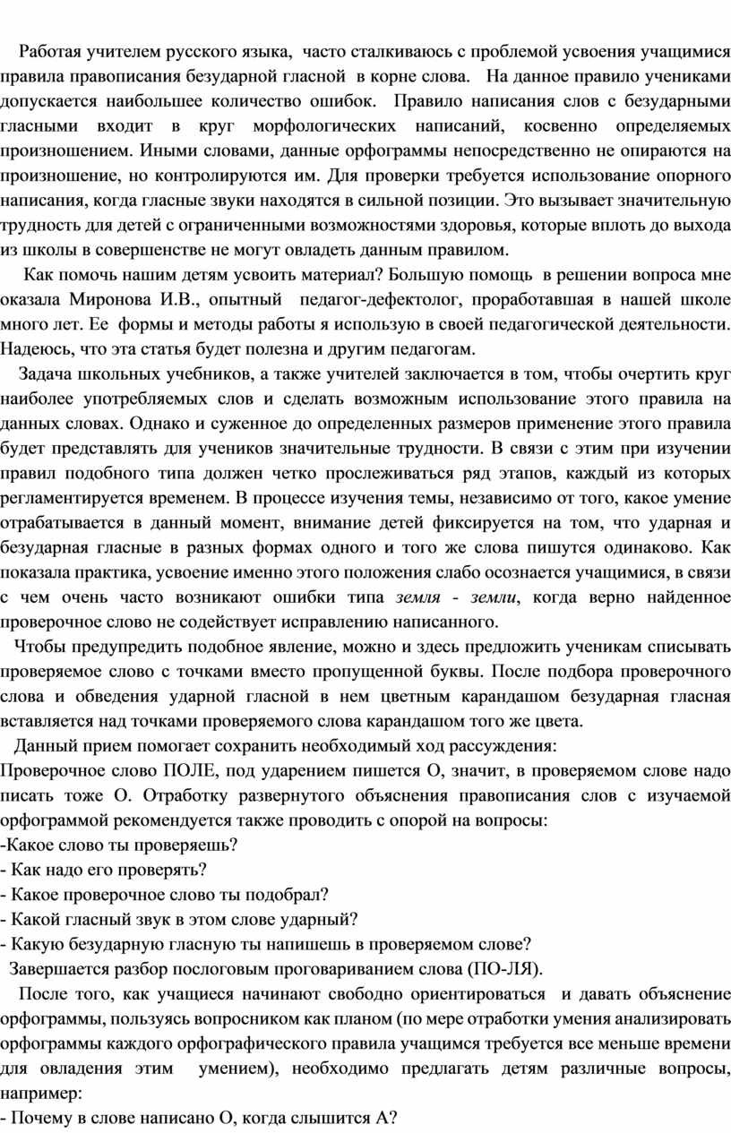 Работая учителем русского языка, часто сталкиваюсь с проблемой усвоения учащимися правила правописания безударной гласной в корне слова. На данное правило учениками допускается наибольшее количество ошибок. Правило написания слов с безударными гласными входит в круг морфологических написаний, косвенно определяемых произношением. Иными словами, данные орфограммы непосредственно не опираются на произношение, но контролируются им. Для проверки требуется использование опорного написания, когда гласные звуки находятся в сильной позиции. Это вызывает значительную трудность для детей с ограниченными возможностями здоровья, которые вплоть до выхода из школы в совершенстве не могут овладеть данным правилом.