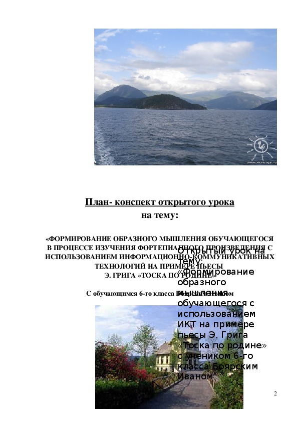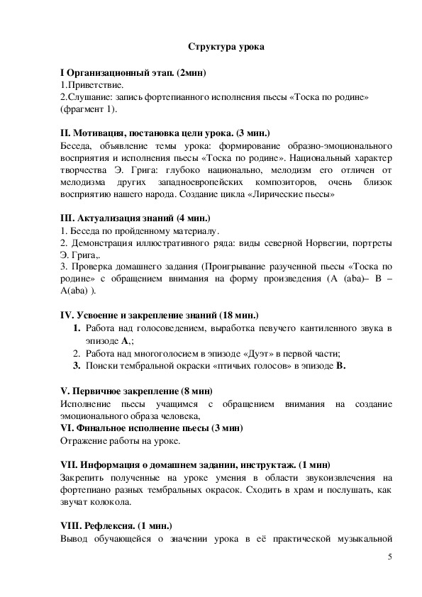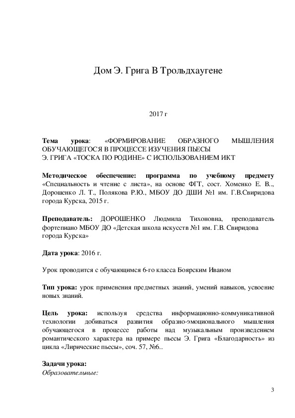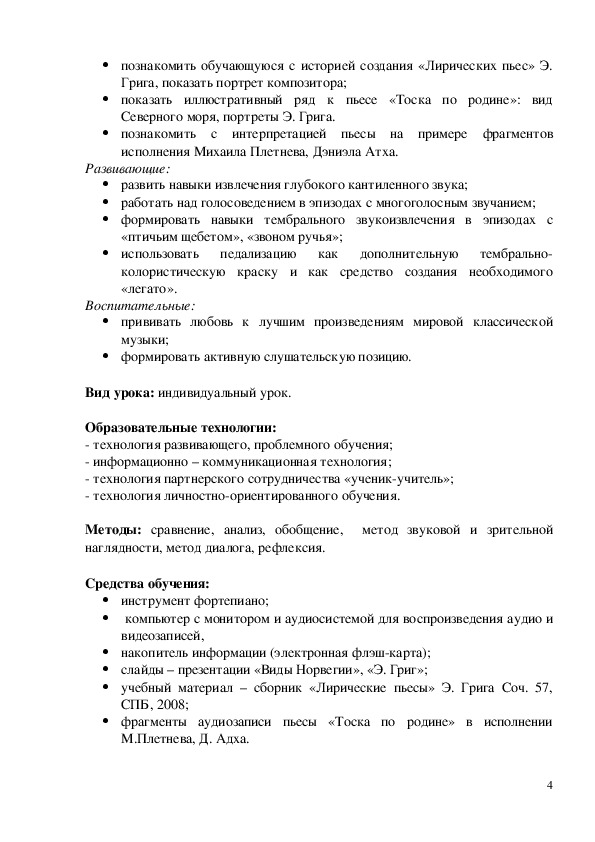 Цель урока: используя средства информационно-коммуникативной технологии добиваться развития образно-эмоционального мышления обучающегося в процессе работы над музыкальным произведением романтического характера на примере пьесы Э. Грига «Благодарность» из цикла «Лирические пьесы», соч. 57, №6..