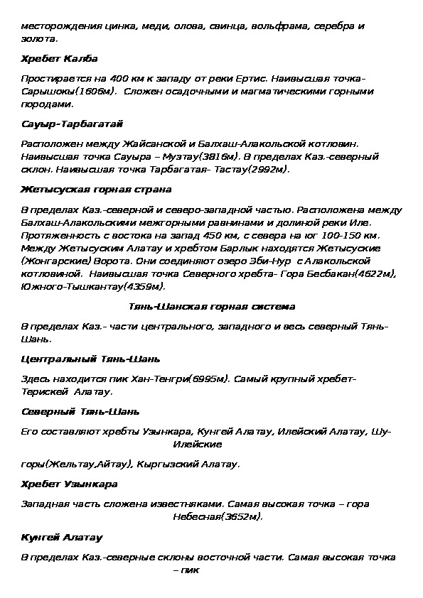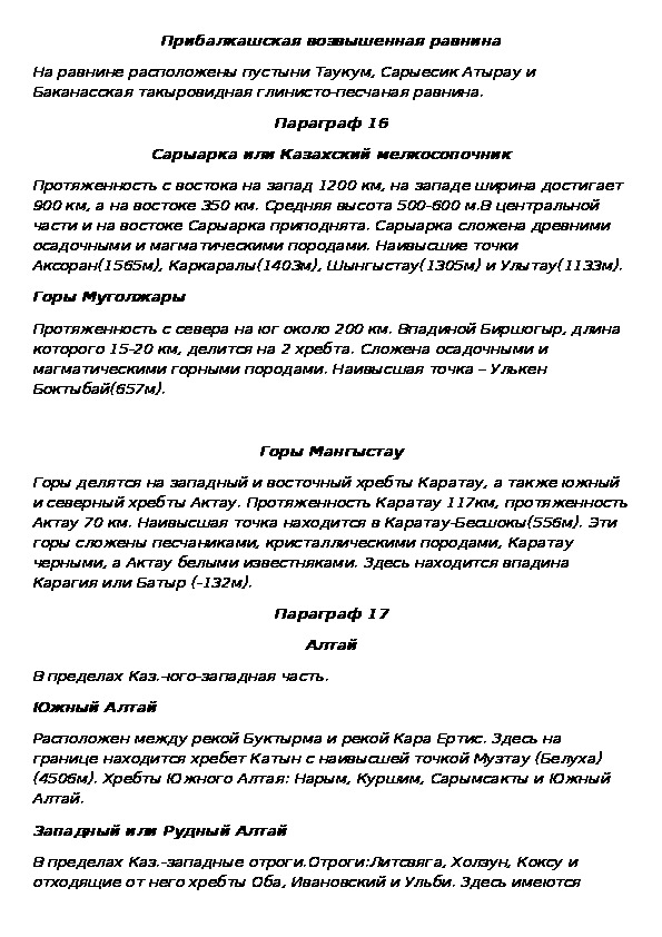 Фактический материал, необходимый ученику для освоения основных географических понятий при изучении равнин, плато, мелкосопочников, горных массивов и систем. Так как учащийся 9 классов в Республике Казахстан должен усвоить более 10 тысяч единиц, то ему просто необходимы "теоретические ядра", которые представляют определённую знаниевую опору.В файле фактический материал, необходимый ученику для освоения основных географических понятий при изучении равнин, плато, мелкосопочников, горных массивов и систем для учащихся 9 классов Республики Казахстан.