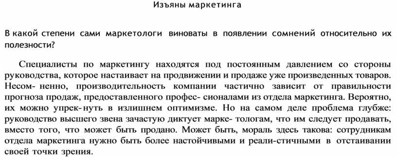 Специалисты по маркетингу находятся под постоянным давлением со стороны руководства, которое настаивает на продвижении и продаже уже произведенных товаров. Несом ненно, производительность компании частично зависит от правильности прогноза продаж, предоставленного профес сионалами из отдела маркетинга. Вероятно, их можно упрек нуть в излишнем оптимизме. Но на самом деле проблема глубже: руководство высшего звена зачастую диктует марке тологам, что им следует продавать, вместо того, что может быть продано. Может быть, мораль здесь такова: сотрудникам отдела маркетинга нужно быть более настойчивыми и реали стичными в отстаивании своей точки зрения.