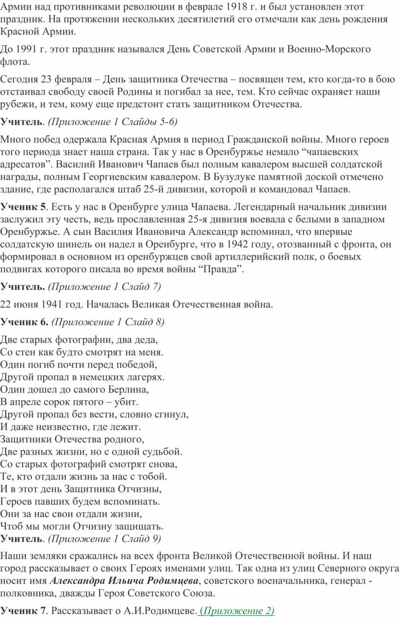 Ученик 5. Есть у нас в Оренбурге улица Чапаева. Легендарный начальник дивизии заслужил эту честь, ведь прославленная 25-я дивизия воевала с белыми в западном Оренбуржье. А сын Василия Ивановича Александр вспоминал, что впервые солдатскую шинель он надел в Оренбурге, что в 1942 году, отозванный с фронта, он формировал в основном из оренбуржцев свой артиллерийский полк, о боевых подвигах которого писала во время войны “Правда”.