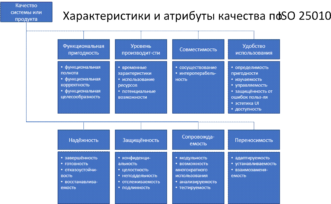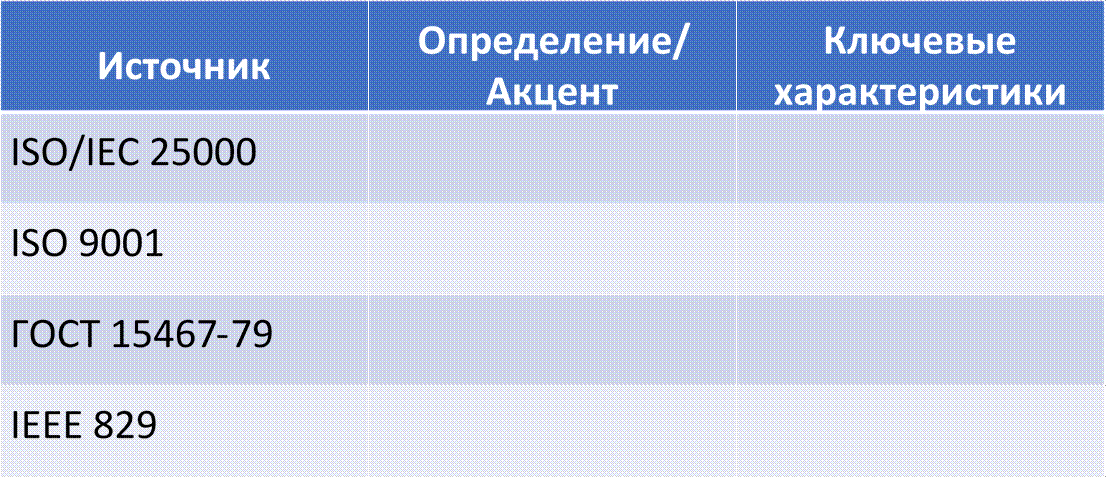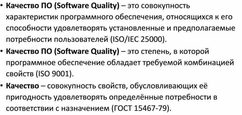 • Качество ПО (Software Quality) – это совокупность характеристик программного обеспечения, относящихся к его способности удовлетворять установленные и предполагаемые потребности пользователей (ISO/IEC 25000).