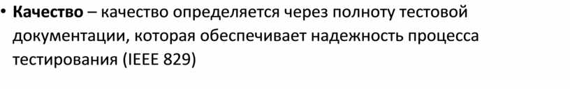 • Качество – качество определяется через полноту тестовой документации, которая обеспечивает надежность процесса тестирования (IEEE 829)
