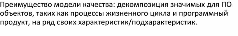 Преимущество модели качества: декомпозиция значимых для ПО объектов, таких как процессы жизненного цикла и программный продукт, на ряд своих характеристик/подхарактеристик.