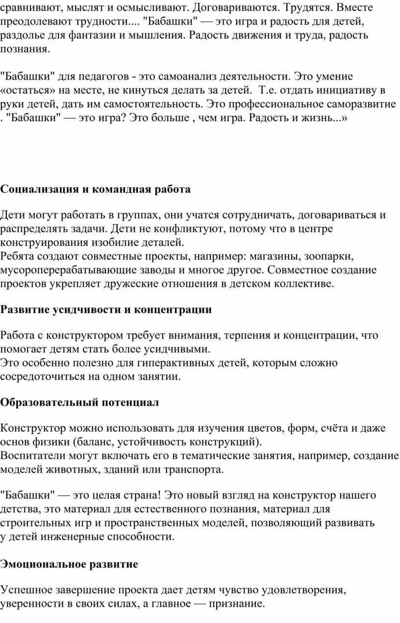 · Конструктор «Бабашки» позволяет детям создавать объемные фигуры и постройки, это развивает пространственное мышление.