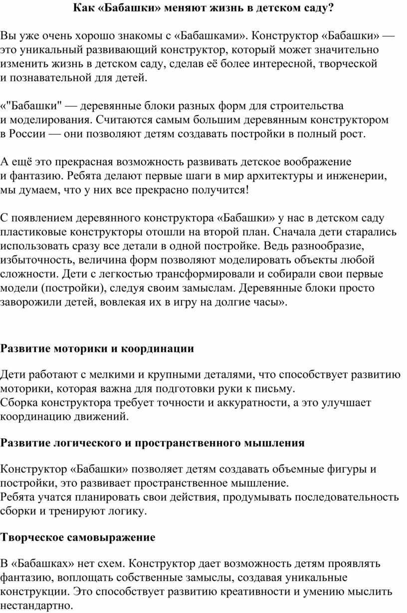 Конструктор «Бабашки» может стать частью семейных мероприятий или выставок, где дети показывают свои работы родителям. Или родители могут самостоятельно попробовать соорудить какую-нибудь постройку по своему замыслу. Это укрепляет связь между детским садом и семьями.