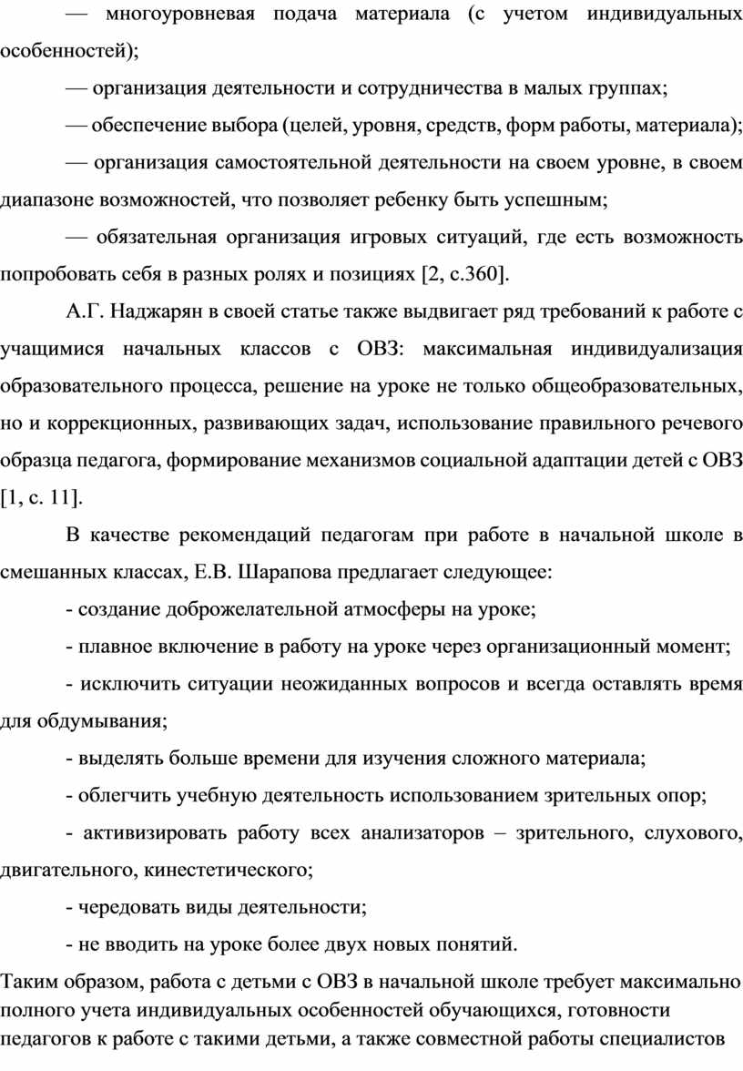 А.Г. Наджарян в своей статье также выдвигает ряд требований к работе с учащимися начальных классов с ОВЗ: максимальная индивидуализация образовательного процесса, решение на уроке не только общеобразовательных, но и коррекционных, развивающих задач, использование правильного речевого образца педагога, формирование механизмов социальной адаптации детей с ОВЗ [1, с. 11].