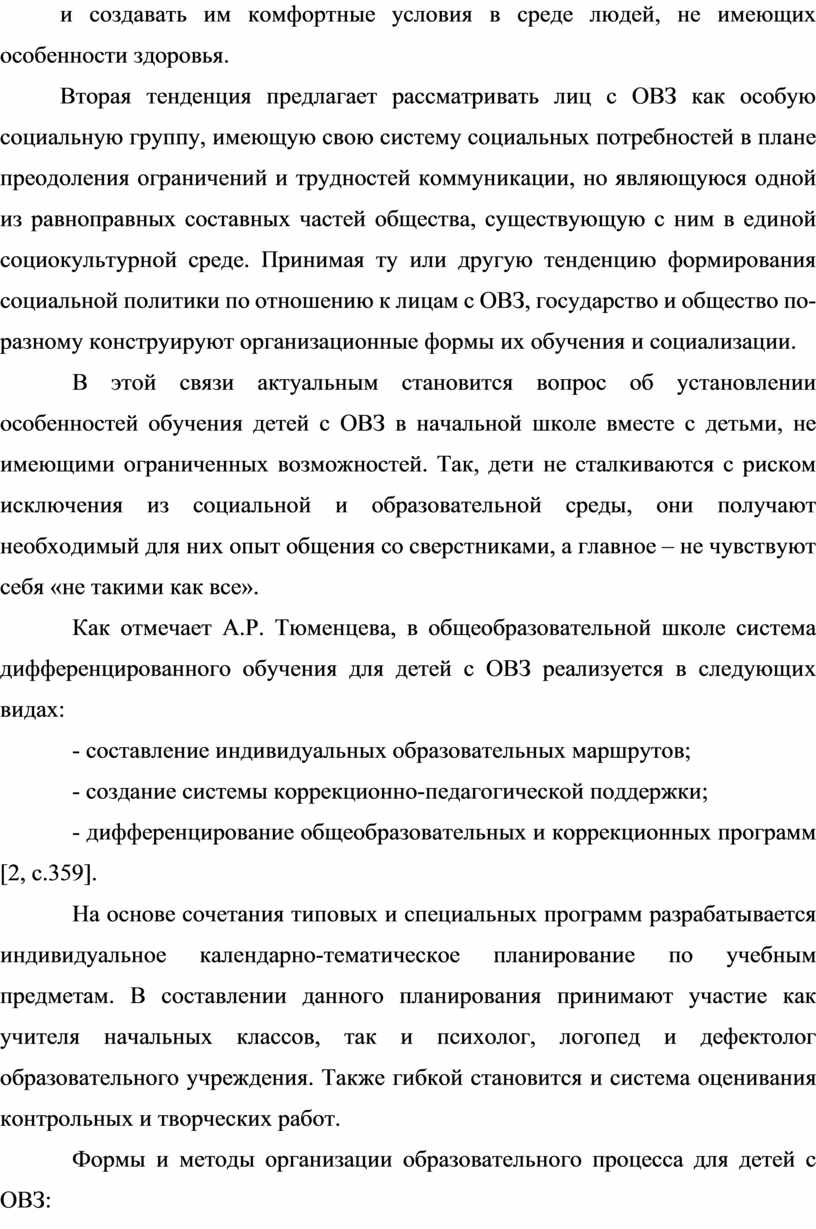 Как отмечает А.Р. Тюменцева, в общеобразовательной школе система дифференцированного обучения для детей с ОВЗ реализуется в следующих видах: