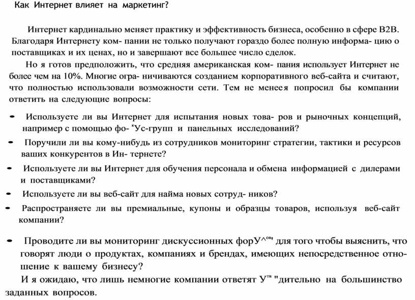 Интернет кардинально меняет практику и эффективность бизнеса, особенно в сфере В2В. Благодаря Интернету ком пании не только получают гораздо более полную информа цию о поставщиках и их ценах, но и завершают все большее число сделок.