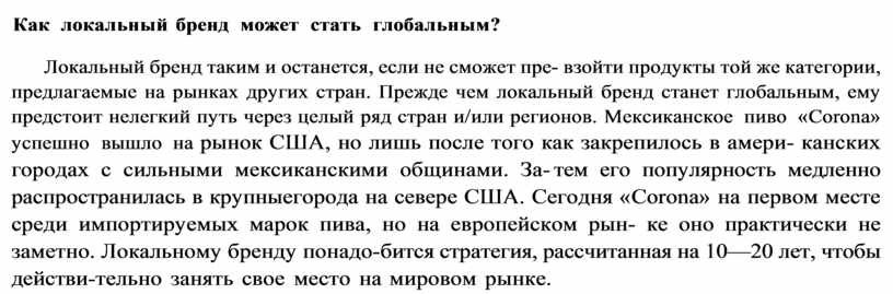 Локальный бренд таким и останется, если не сможет пре взойти продукты той же категории, предлагаемые на рынках других стран. Прежде чем локальный бренд станет глобальным, ему предстоит нелегкий путь через целый ряд стран и/или регионов. Мексиканское пиво «Corona» успешно вышло на рынок США, но лишь после того как закрепилось в амери канских городах с сильными мексиканскими общинами. За тем его популярность медленно распространилась в крупные города на севере США. Сегодня «Corona» на первом месте среди импортируемых марок пива, но на европейском рын ке оно практически не заметно. Локальному бренду понадо бится стратегия, рассчитанная на 10—20 лет, чтобы действи тельно занять свое место на мировом рынке.