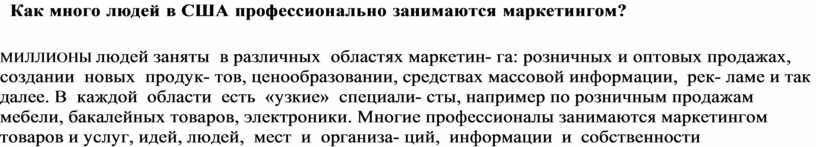 МИЛЛИОНЫ людей заняты в различных областях маркетин га: розничных и оптовых продажах, создании новых продук тов, ценообразовании, средствах массовой информации, рек ламе и так далее. В каждой области есть «узкие» специали сты, например по розничным продажам мебели, бакалейных товаров, электроники. Многие профессионалы занимаются маркетингом товаров и услуг, идей, людей, мест и организа ций, информации и собственности