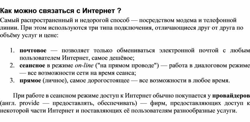Самый распространенный и недорогой способ — посредством модема и телефонной линии. При этом используются три типа подключения, отличающиеся друг от друга по объёму услуг и цене: