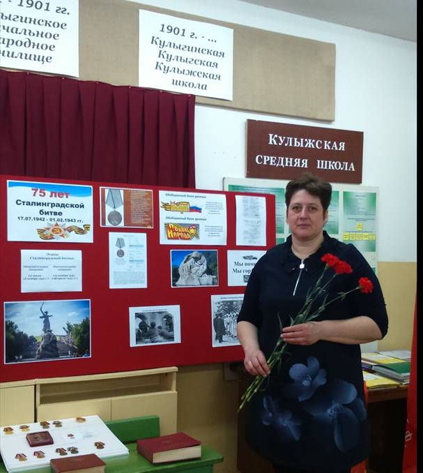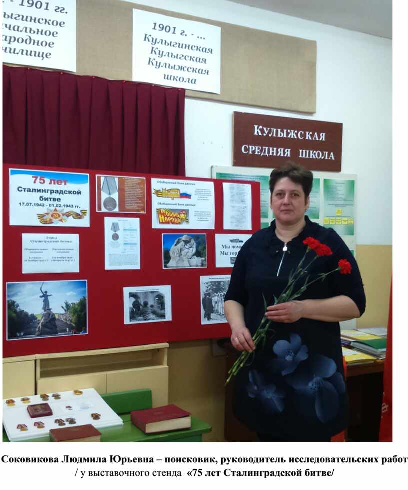 Соковикова Людмила Юрьевна – поисковик, руководитель исследовательских работ / у выставочного стенда «75 лет Сталинградской битве/