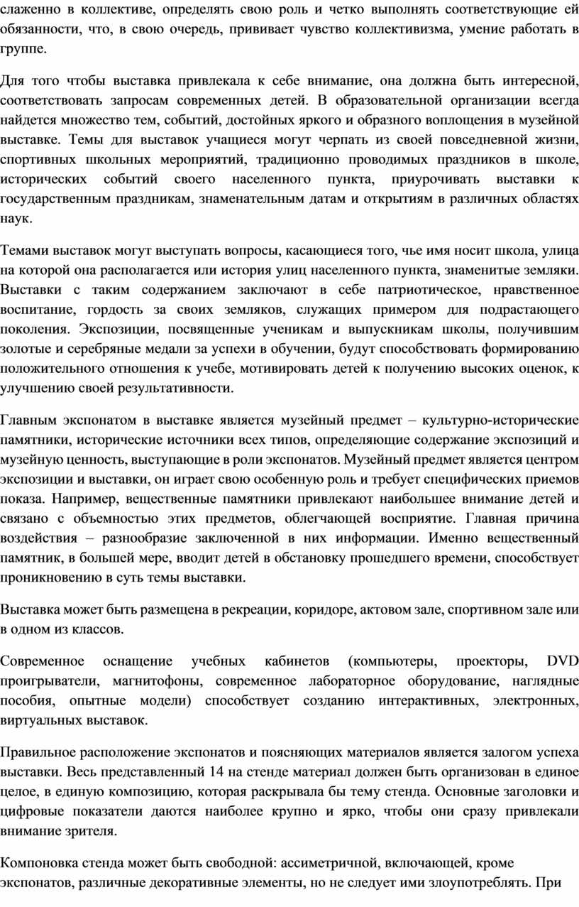 Привлечение учащихся к созданию тематических выставок вырабатывает у них определенные навыки и умения: способность анализировать, отбирать наиболее информативные материалы, решать проблему показа собранных предметов, отстаивать свою точку зрения в решении поставленного перед ними вопроса. Выставки, организуемые в образовательных организациях, помогают детям научиться работать слаженно в коллективе, определять свою роль и четко выполнять соответствующие ей обязанности, что, в свою очередь, прививает чувство коллективизма, умение работать в группе.