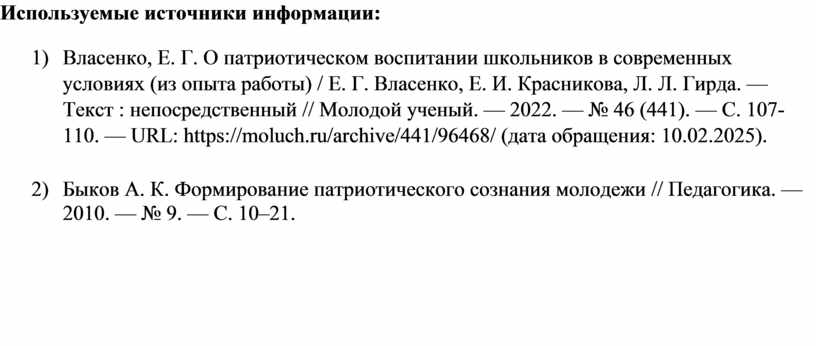 1) Власенко, Е. Г. О патриотическом воспитании школьников в современных условиях (из опыта работы) / Е. Г. Власенко, Е. И. Красникова, Л. Л. Гирда. — Текст : непосредственный // Молодой ученый. — 2022. — № 46 (441). — С. 107-110. — URL: https://moluch.ru/archive/441/96468/ (дата обращения: 10.02.2025).