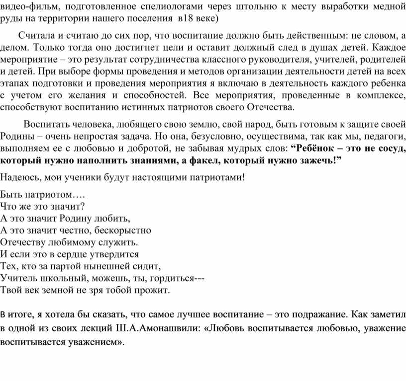 Считала и считаю до сих пор, что воспитание должно быть действенным: не словом, а делом. Только тогда оно достигнет цели и оставит должный след в душах детей. Каждое мероприятие – это результат сотрудничества классного руководителя, учителей, родителей и детей. При выборе формы проведения и методов организации деятельности детей на всех этапах подготовки и проведения мероприятия я включаю в деятельность каждого ребенка с учетом его желания и способностей. Все мероприятия, проведенные в комплексе, способствуют воспитанию истинных патриотов своего Отечества.