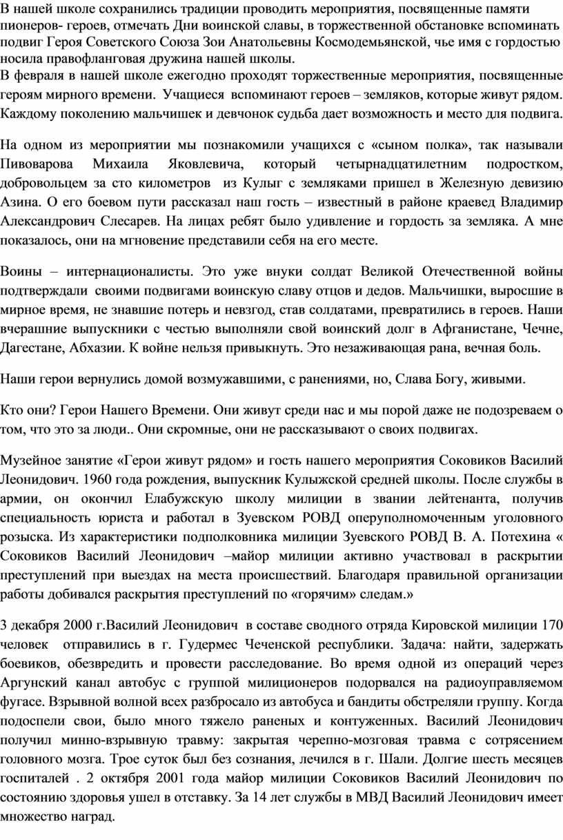 Музейное занятие «Герои живут рядом» и гость нашего мероприятия Соковиков Василий Леонидович. 1960 года рождения, выпускник Кулыжской средней школы. После службы в армии, он окончил Елабужскую школу милиции в звании лейтенанта, получив специальность юриста и работал в Зуевском РОВД оперуполномоченным уголовного розыска. Из характеристики подполковника милиции Зуевского РОВД В. А. Потехина « Соковиков Василий Леонидович –майор милиции активно участвовал в раскрытии преступлений при выездах на места происшествий. Благодаря правильной организации работы добивался раскрытия преступлений по «горячим» следам.»