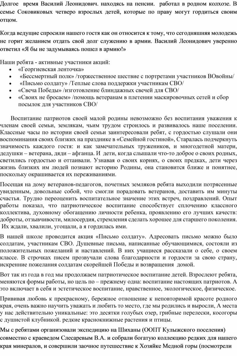 Поэтому школа должна стремиться и сейчас сохранять для молодого поколения бесценные реликвии: документы, фотографии, письма. И именно патриотическое воспитание подрастающего поколения является одной из важнейших задач современной школы, ведь детство и юность – самая благодатная пора для привития священного чувства любви к Родине.