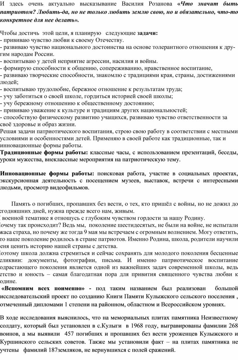 И здесь очень актуально высказывание Василия Розанова «Что значит быть патриотом? Любить-да, но не только любить землю свою, но и обязательно, что-то конкретное для нее делать».