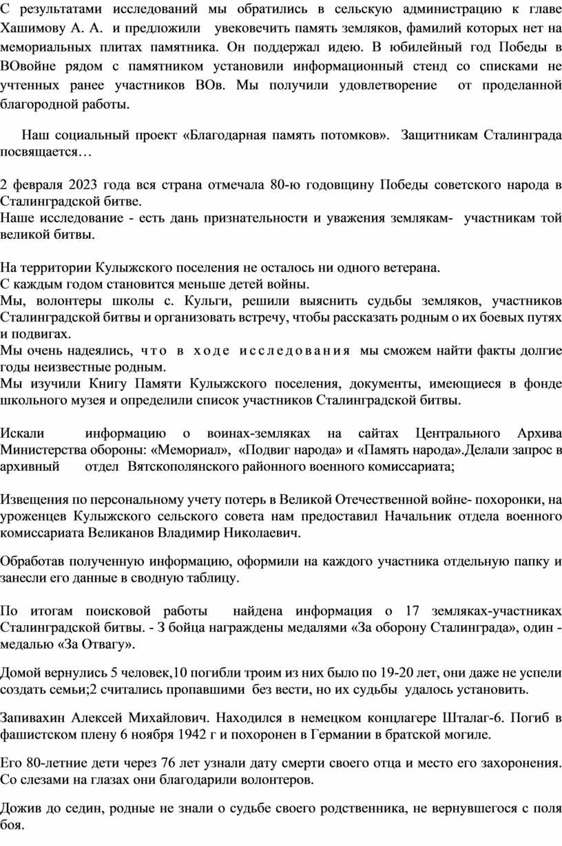 Мы, волонтеры школы с. Кульги, решили выяснить судьбы земляков, участников Сталинградской битвы и организовать встречу, чтобы рассказать родным о их боевых путях и подвигах.