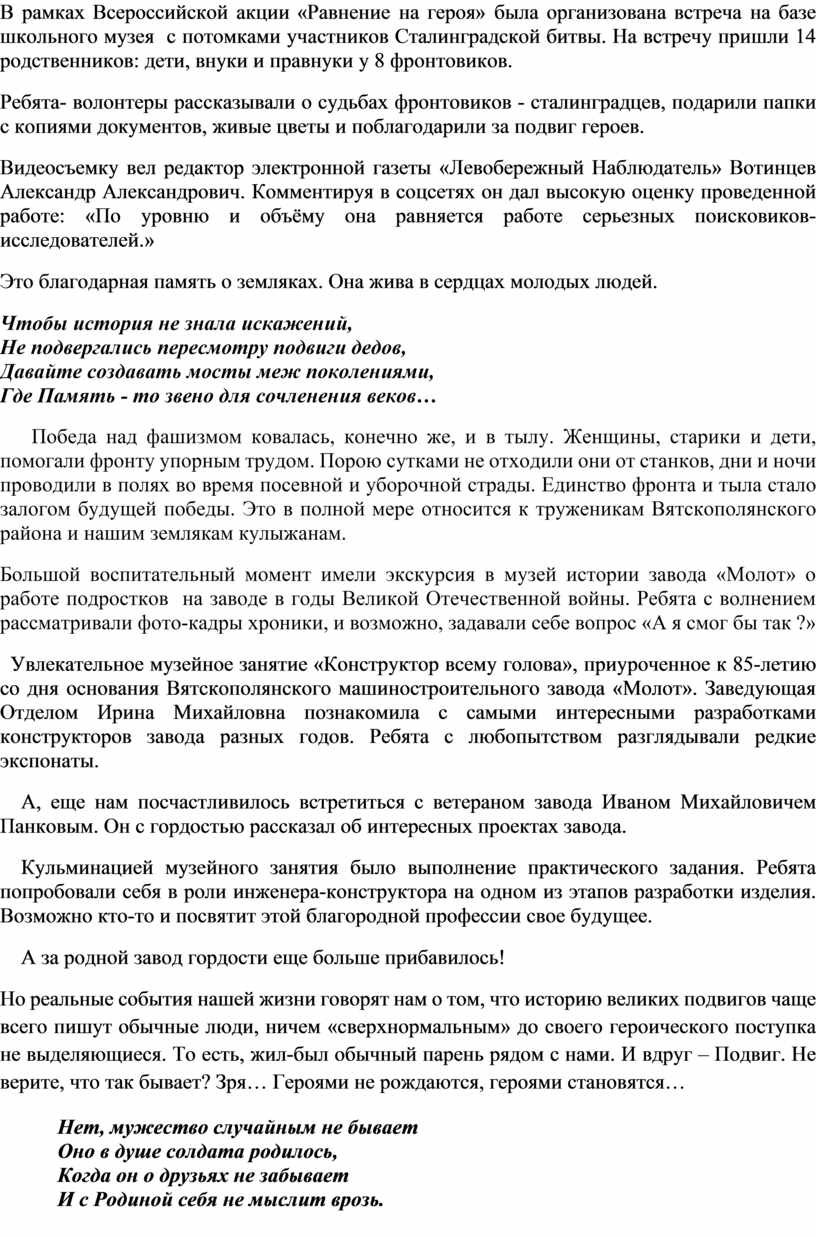 В рамках Всероссийской акции «Равнение на героя» была организована встреча на базе школьного музея с потомками участников Сталинградской битвы. На встречу пришли 14 родственников: дети, внуки и правнуки у 8 фронтовиков.