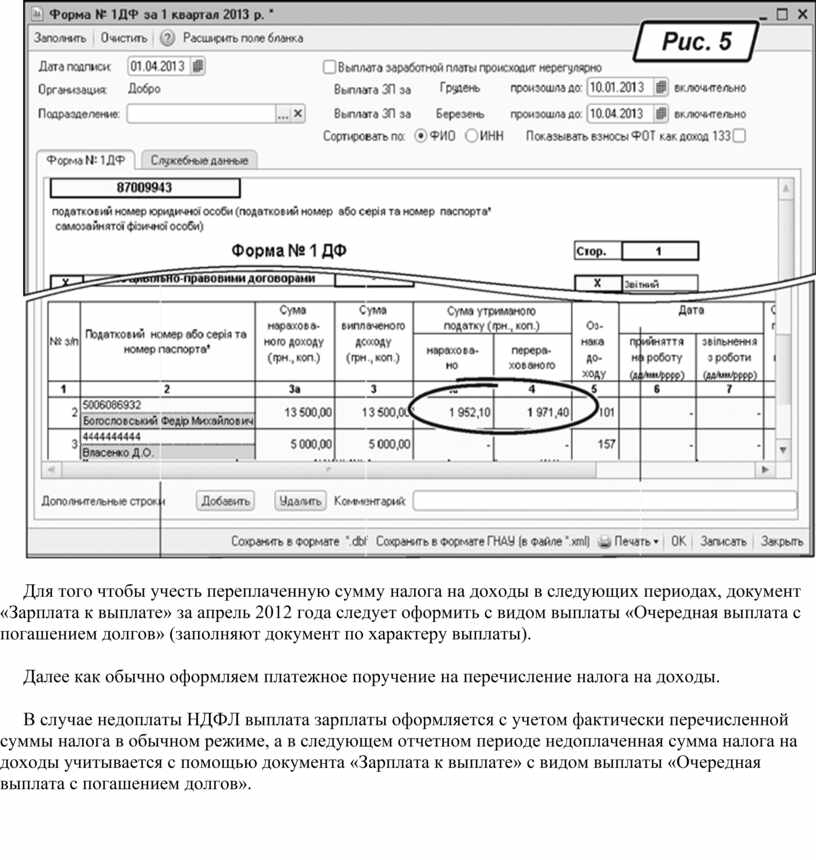 Выполнив последовательность описанных выше действий, вы получите в базе корректно отраженную переплату НДФЛ. Благодаря этому сумма переплаты будет автоматически отражена в регламентированном отчете по форме № 1ДФ. На рис. 5 приведен фрагмент сформированного отчета по форме № 1ДФ, разница между графами «4а» и «4» составит 19,30 грн. — это и есть сумма переплаты НДФЛ.