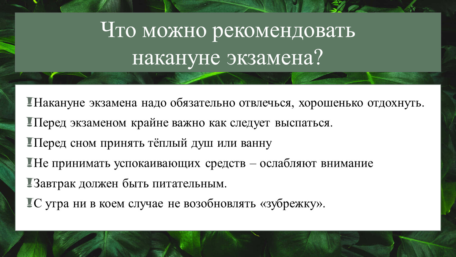 Накануне экзамена надо обязательно отвлечься, хорошенько отдохнуть.