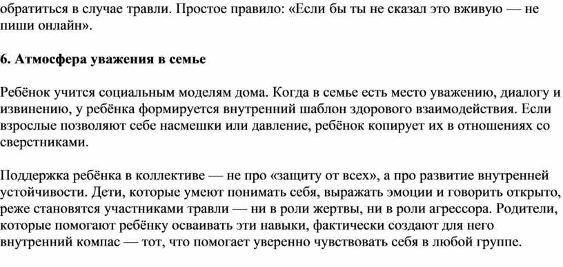 Современный буллинг всё чаще начинается в интернете. Важно обсуждать с ребёнком, какие сообщения можно публиковать, как реагировать на обидные комментарии и к кому обратиться в случае травли. Простое правило: «Если бы ты не сказал это вживую — не пиши онлайн».