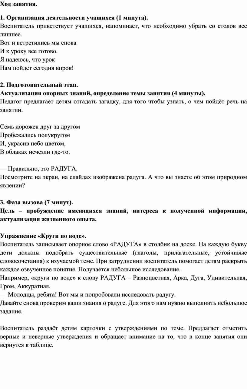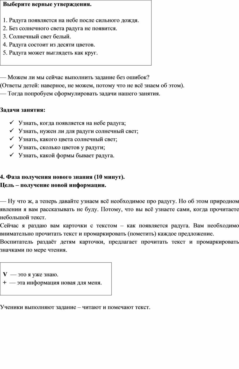 Воспитатель раздаёт детям карточки с утверждениями по теме. Предлагает отметить верные и неверные утверждения и обращает внимание на то, что в конце занятия они вернутся к таблице.