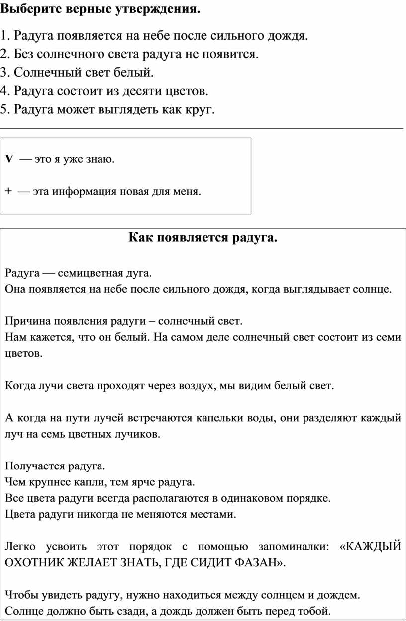 — Ну что ж, а теперь давайте узнаем всё необходимое про радугу. Но об этом природном явлении я вам рассказывать не буду. Потому, что вы всё узнаете сами, когда прочитаете небольшой текст.