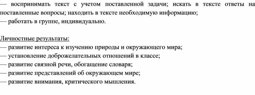 — воспринимать текст с учетом поставленной задачи; искать в тексте ответы на поставленные вопросы; находить в тексте необходимую информацию;