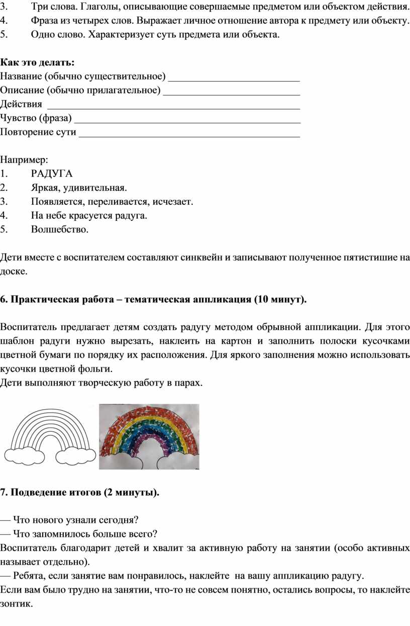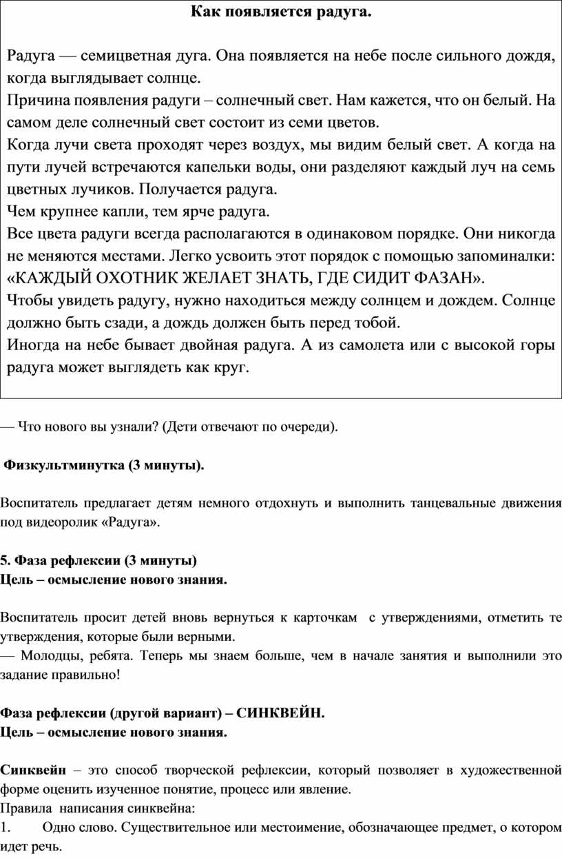 Цель: создать условия для формирования представлений о природном явлении - радуга, научить составлять синквейн на этапе осмысления изученного материала.