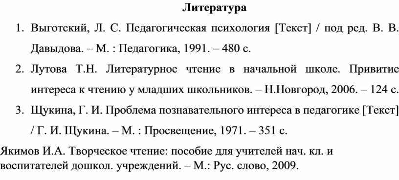 1. Выготский, Л. С. Педагогическая психология [Текст] / под ред. В. В. Давыдова. – М. : Педагогика, 1991. – 480 с.